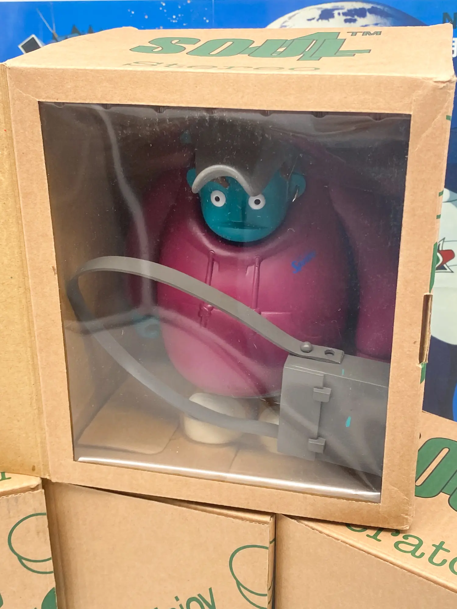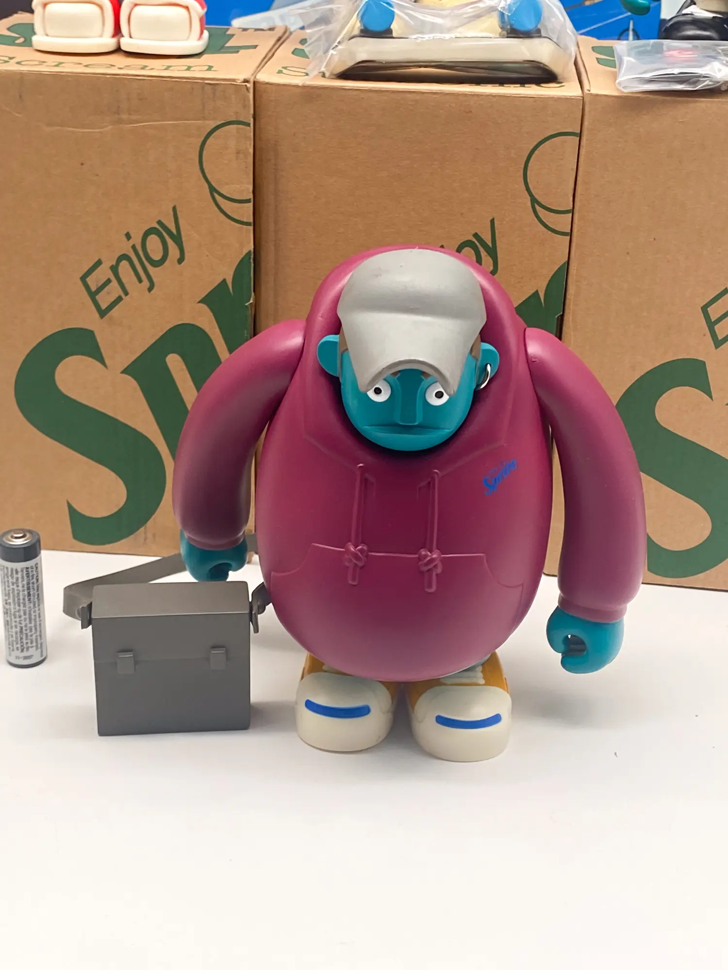 • Stereo (La figurine pourpre massive) : Livrée avec son sac bandoulière gris. Un design imposant et culte.
