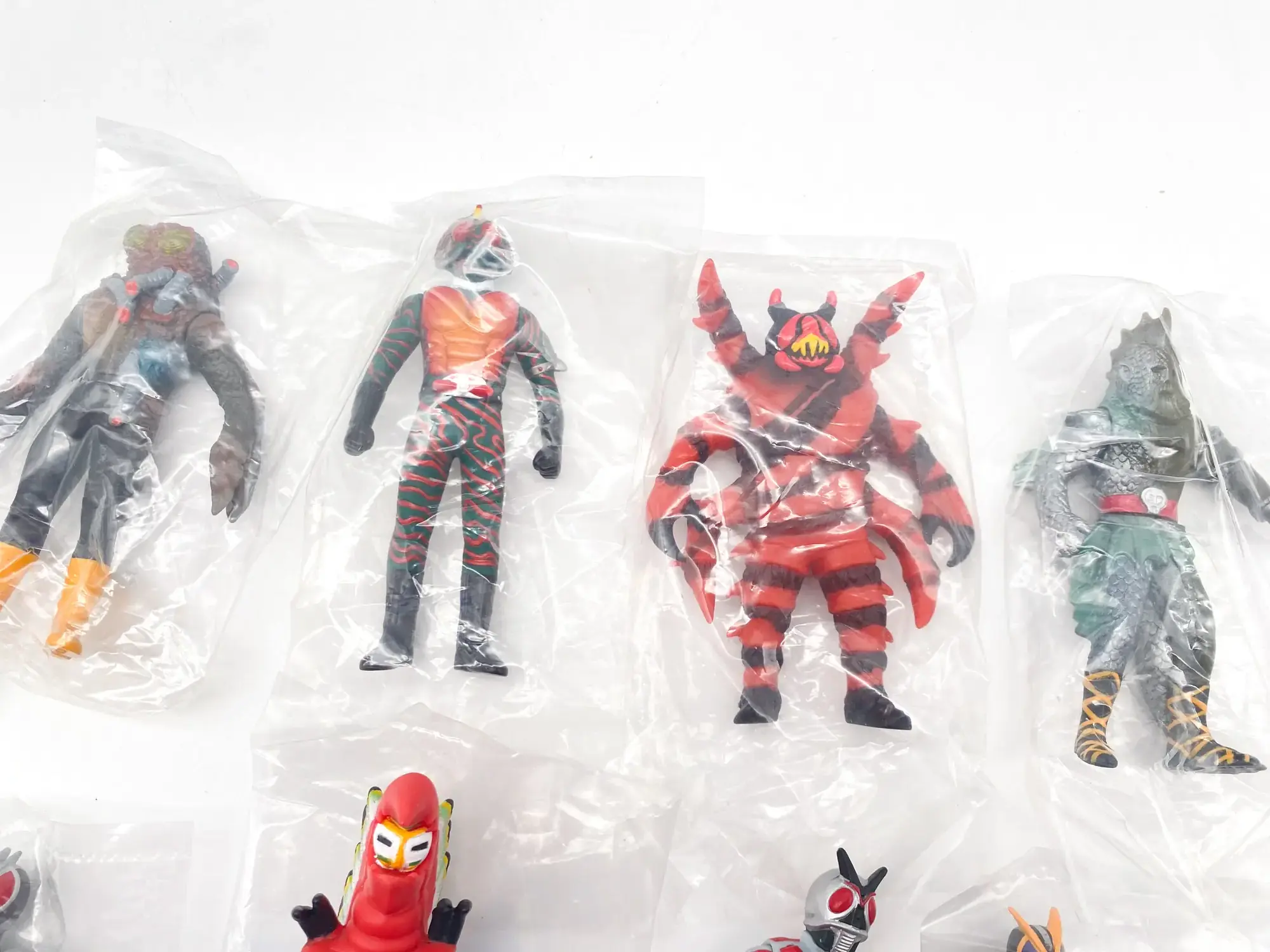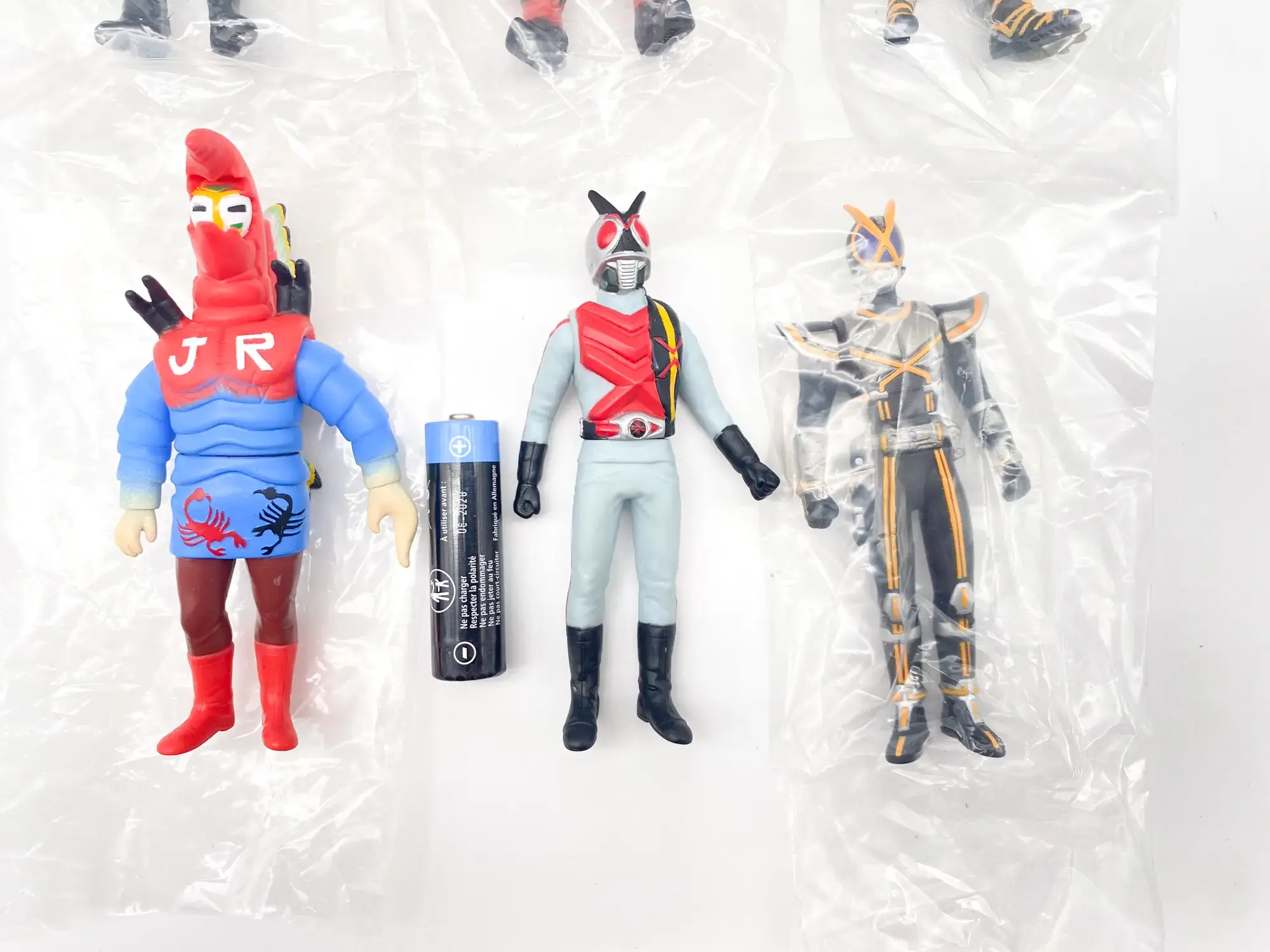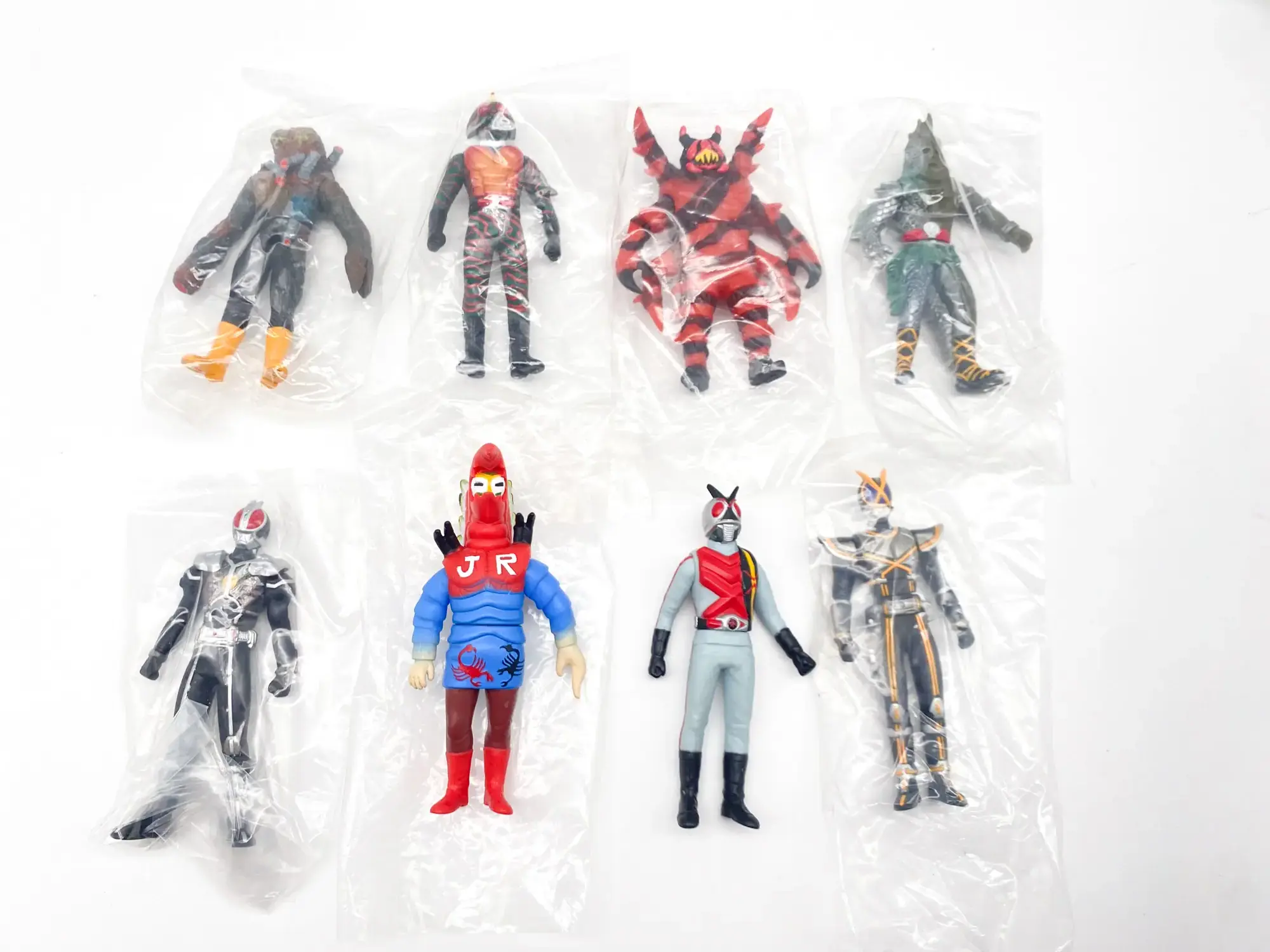 Voici le set complet Kamen Rider Sofubi Road EPISODE:3, sorti en 2002. Cette série est une lettre d’amour aux figurines « Pachi » et aux premiers jouets de la Toei. Elle réunit le célèbre Kamen Rider X et l’animalier Kamen Rider Amazon, accompagnés de leurs ennemis les plus mythiques. Une esthétique volontairement « vintage » qui capture parfaitement le grain des séries originales.