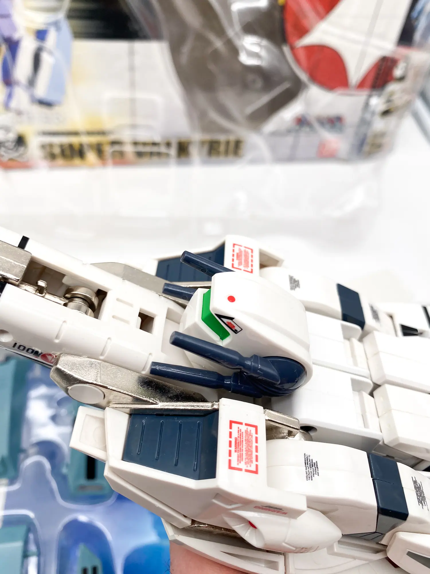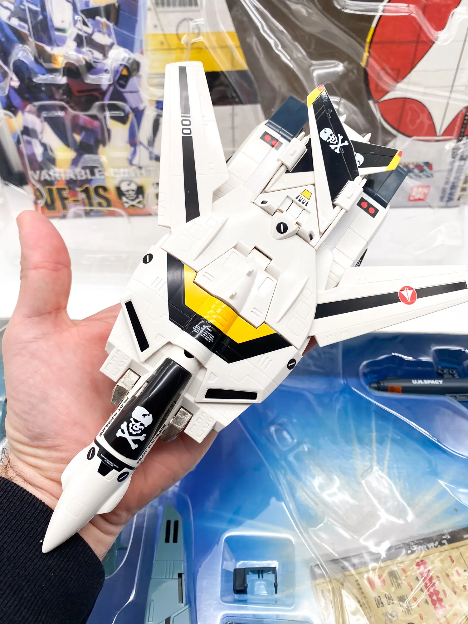 Macross (ou Robotech pour les fans de la première heure) ! Ce modèle représente l’emblématique VF-1S piloté par le légendaire Hikaru Ichijo (Rick Hunter). Avec son design reconnaissable entre mille et ses marquages « Skull Leader », cette pièce incarne l’âge d’or des Mechas transformables. Ce n’est pas juste un jouet, c’est une pièce d’ingénierie vintage qui a marqué des générations de fans. ✈️🤖