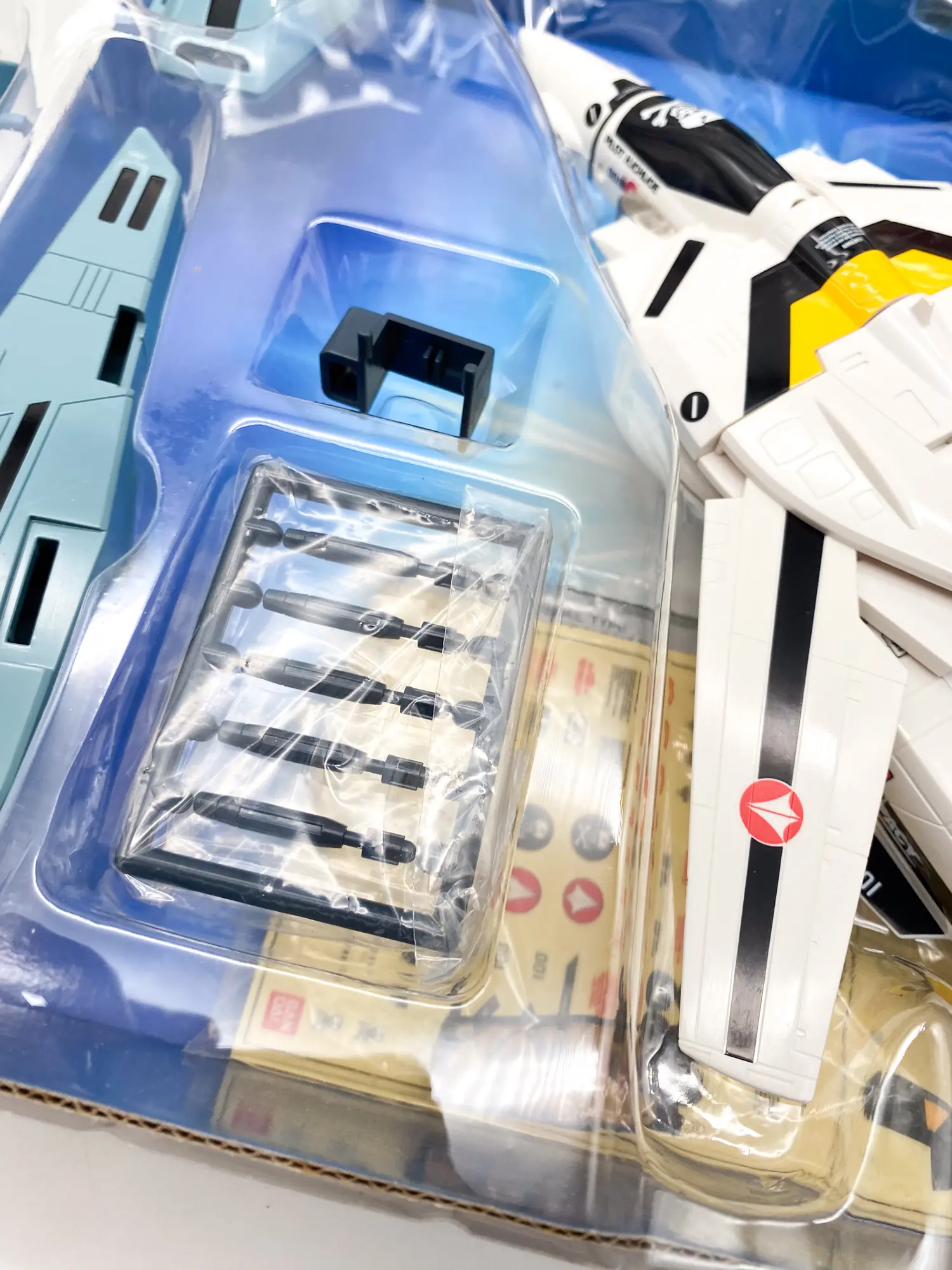 - État du contenu : MINT / NEUF. Les grappes d’accessoires (missiles, packs) sont encore scellées ou intactes dans leurs logements. L’avion présente des couleurs vives, sans jaunissement apparent. 💎